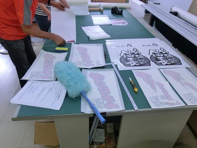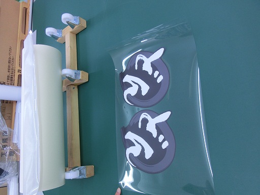 まずは印刷したデザインをカットマシンでロゴの形にカットします。