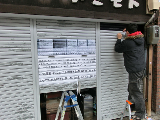 先日、たばこ店のシャッター面の張り替え作業を致しました。