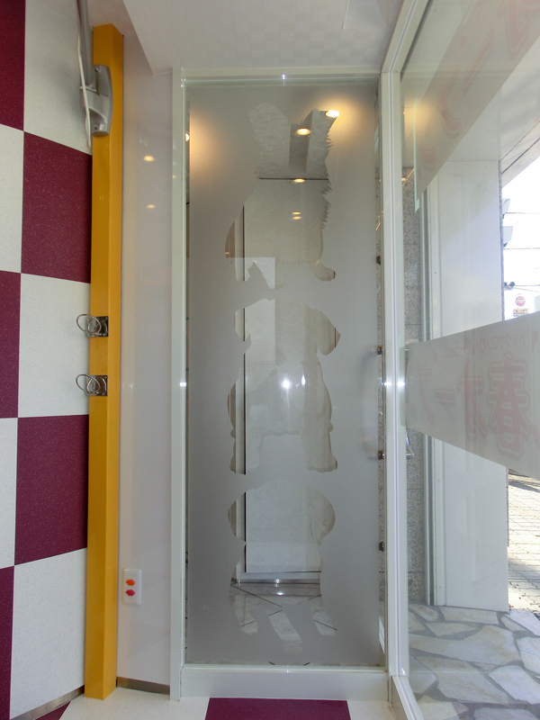 店舗窓面にも擦りガラス状のシートを貼りつけ